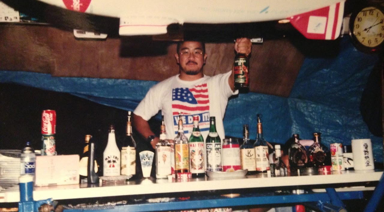 会社の独身寮の裏に空き地と廃材があったので小屋を作って「TAMON'S BAR」を開業1993年春